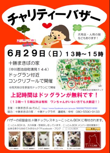 6月29日(日) 13時〜15時十勝の池田町にある十勝まきばの家にて十勝まきばDEわんこさん主催のチャリティバザーが開催されます! 時間限定ですがドッグランが無料になったり犬用品や人用の物などお得に入手できるバザーワンコ家族には楽しめること間違…