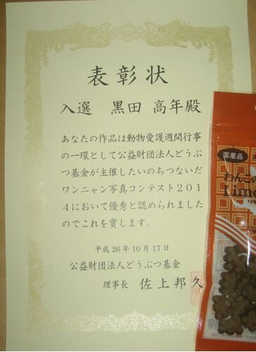 ご報告です。 公益財団法人どうぶつ基金主催の「いのちつないだワンニャン写真コンテスト2014」に1枚応募いたしました当会出身のVenの「だけどねえ〜」が10月の審査で入選となりました。 本日、基金より表彰状が届きました。 副賞は素晴らしいドック…