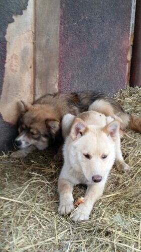 人馴れしていない子犬などをしつけてくれるしおんの子犬教育係アケモリ兄弟の犬舎で一緒に暮らしている野犬の子トリオ、元真&天助&春吉ドッグランで遊んだ後、朝ごはんの時のガム食べ中の昨日の動画です 写真2枚目…手前から天助(てんすけ)、元真(がんま)…