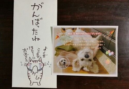 8月も終わりですが今月7日に設立13年目を迎えた当会に札幌のTさんからお祝いが届きましたU^ェ^U4年前に当会を訪ねて来て下さったTさんご夫妻子供同様に可愛がっていたクッキーちゃんを亡くされお会いした時は心に深い痛みを背負い悲しみの中にいましたが …